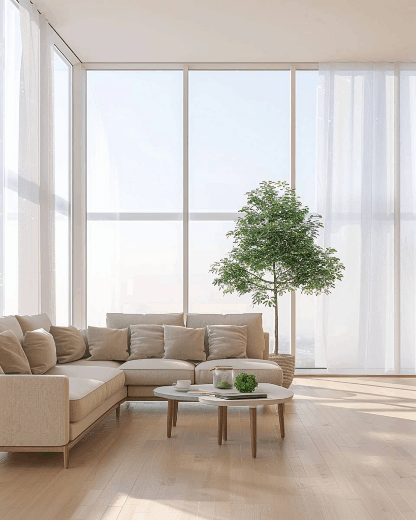 Wohnzimmer mit Panoramafenster- Nutze transparente Vorhänge für sanfte Lichtfilterung