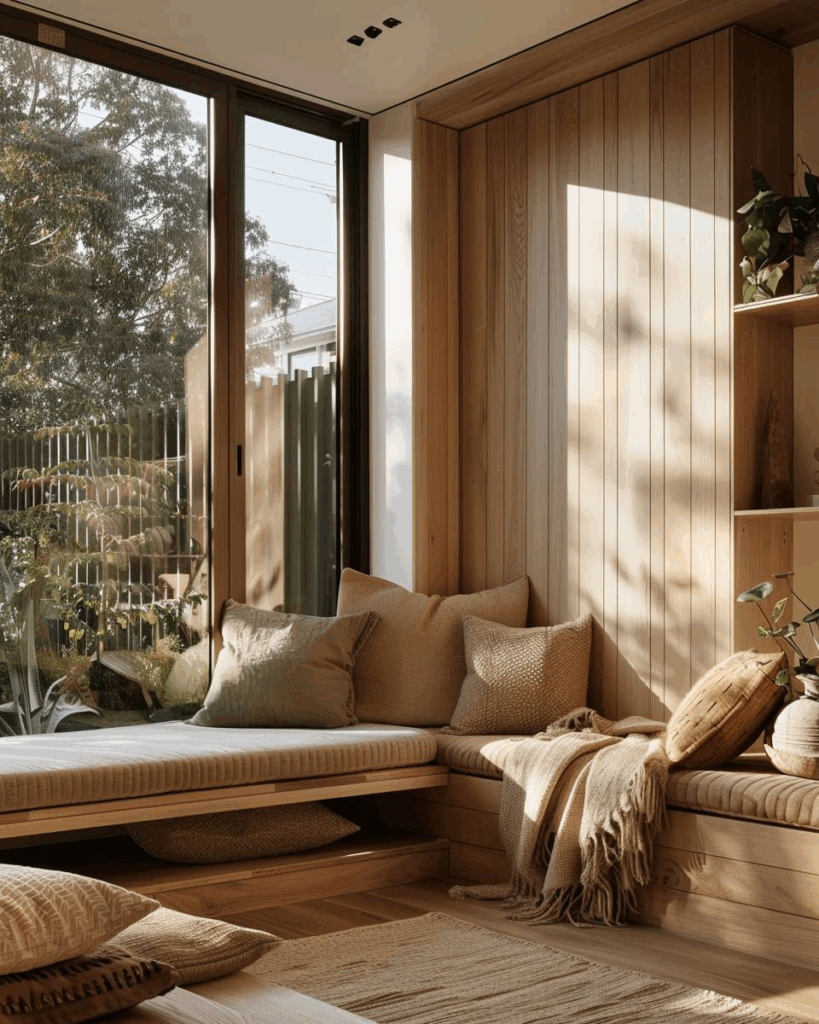 Setze eine stabile Fensterbank aus Holz ein, die mindestens 45 cm tief ist. Beachte, dass wir einen tragfähigen Unterbau mit Winkeln oder Sitzkonsolen brauchen. Polster erhöhen den Sitzkomfort und Kissen machen die Nische gemütlich. Pflanzen und Bücher finden auf der breiten Fläche genug Platz. Durch ein großes Panoramafenster bekommst du viel Tageslicht und Aussicht.