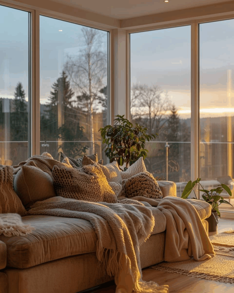 Setze verschiedene Stoffe ein, damit dein Wohnzimmer gemütlich ist. Wir mischen weiche Decken, kuschelige Kissen und grobe Teppiche. Holz, Leder und Wolle geben einen warmen Kontrast zu deinem Panoramafenster. Damit fühlt sich der Raum einladend und lebendig an.
