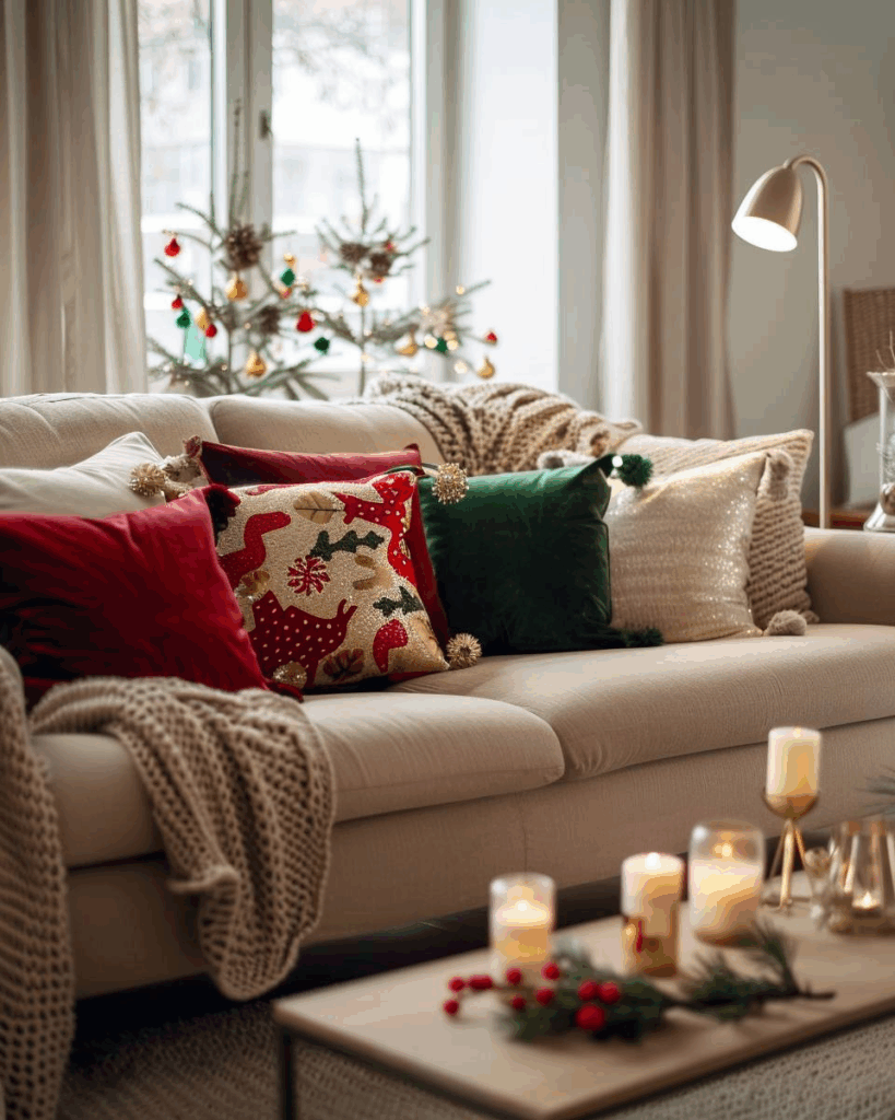 Arrangiere gemütliche Kissen in Weihnachtsfarben