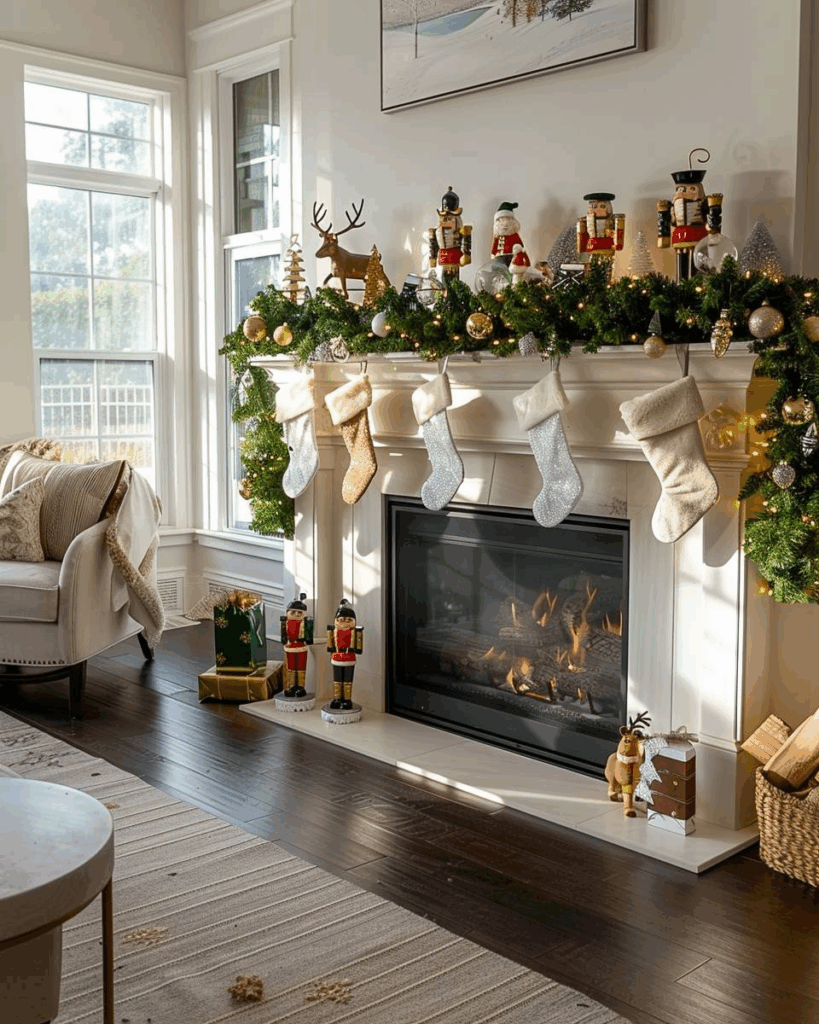 Stelle festliche Figuren wie Rentiere, Weihnachtsmänner oder Engel auf dein Kaminregal. Wir rücken große Figuren in die Mitte und kleine an die Seiten. Setze Lichterketten oder Tannenzweige dazwischen, um alles zu verbinden.