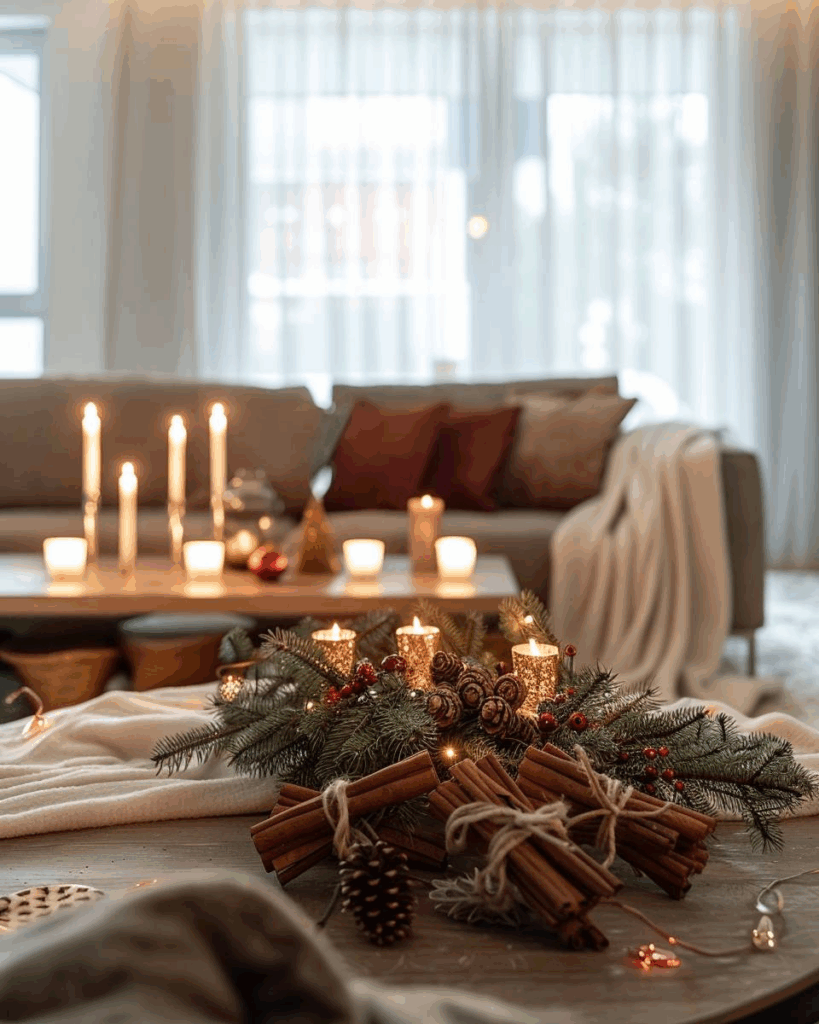 Platziere duftende Tannenzweige auf dem Couchtisch