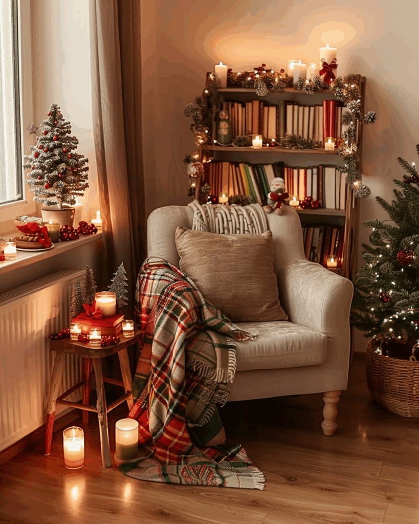 Kreiere eine Leseecke mit Weihnachtsbüchern und Kerzen